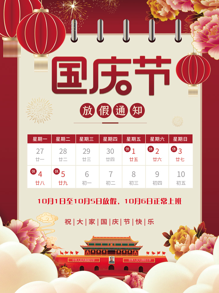 國慶假期即將來臨,中華人民共和國迎來72周年華誕,在這里祝福我們偉大的祖國繁榮昌盛。根據(jù)《國務(wù)院辦公廳關(guān)于2021年部分節(jié)假日安排的通知》,結(jié)合我公司的實際情況,現(xiàn)將我公司國慶節(jié)假期具體安排如下: